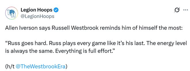 前NBA球星艾弗森在最近的一次节目上也谈到威少,他认为威少是现役中最让他想起自己的球员。“他打球拼劲十足,每场比赛都像最后一场一样全力以赴。他的能量始终保持在同一水准,做任何事都付出全部努力。”