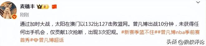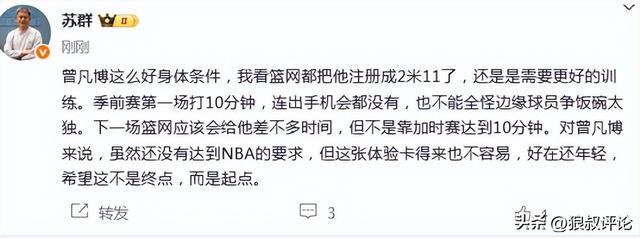 媒体人苏群发文点评:曾凡博这么好身体条件,我看篮网都把他注册成2米11了,还是需要更好的训练。季前赛第一场打10分钟,连出手机会都没有,也不能全怪边缘球员争饭碗太独。下一场篮网应该会给他差不多时间,但不是靠加时赛达到10分钟。对曾凡博来说,虽然还没有达到NBA的要求,但这张体验卡得来也不容易,好在还年轻,希望这不是终点,而是起点。