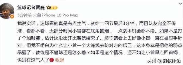 篮球记者贾磊发文点评:我说实话,这球看的真是有点生气,就给二四节最后3分钟,而且队友完全不传球,看都不看,大部分时间小曾都在底角抽烟,一点战术机会都不给。如果不是打了个加时赛,估计还没出汗比赛就结束了。